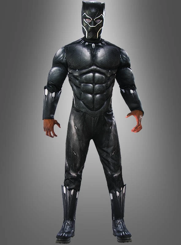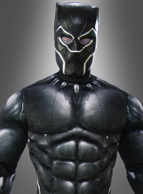 Das Black Panther Herrenkostüm ist ein bedruckter schwarzer Overall mit gepolsterten Muskeln aus Schaumstoff. Der Druck stellt T’Challas Kampfanzug dar. Im Halsbereich ist seine Halskette aufgedruckt. Die angenähten Armschienen und Schuhüberzieher aus Schaumstoff ergeben einen schönen 3D Effekt. Auf der Rückseite befindet sich Klettverschluss, um das An- und Ausziehen zu vereinfachen. Wer Hilfe hierbei benötigt findet als König sicherlich einen pflichtbewussten Untertanen.