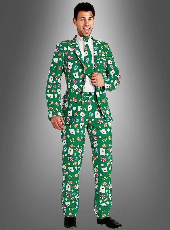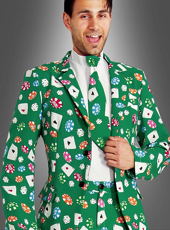 Fordern Sie ihr Glück heraus! Denn das ganze Leben ist ein Spiel… Lustiger Herrenanzug in grün bedruckt mit Casino Spielchips, Würfel und Spielkarten. Das Jackett ist vorne knöpfbar und hat zwei seitliche Taschen zum Verstauen ihrer Spielchips. Revers und Kragen sind leicht verstärkt. Die Hose hat im hinteren Bundbereich einen bequemen Gummizug eingenäht. Vorne wird die Hose mit Reißverschluss und Knopf verschlossen. Gürtelschlaufen sind am Bund angenäht. Seitliche Eingrifftaschen bereichern die Hose. Mit dabei ist auch die Krawatte, die sie nicht umständlich binden müssen. Ein Gummiband ist angebracht und so können Sie den Schlips einfach überstülpen. Perfekt für die Mottoparty Las Vegas!