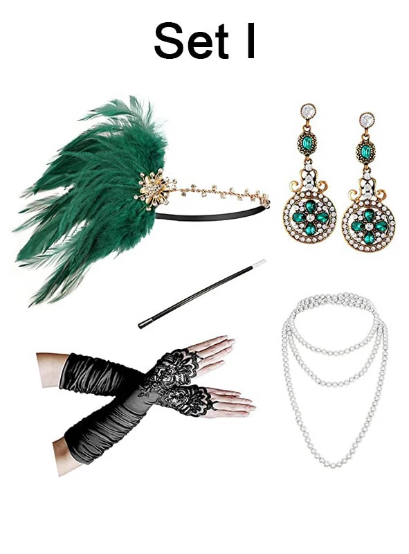 Bei den Sets ist immer ein Haarband Kopfschmuck mit echten Federn dabei. Perlenketten, die in den 20er Jahre sehr beliebt waren und ein langer Zigarettenhalter sind geradezu ein Must-have bei Golden Twenties Partys. Wenn Ohrringe im Set sind, dann benötigen Sie hier auf jeden Fall durchstochene Ohrläppchen. Denn es handelt sich um Ohrstecker. Die langen Galahandschuhe oder Armstulpen sehen sehr elegant aus.