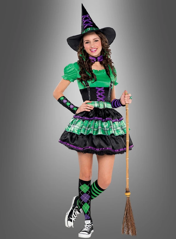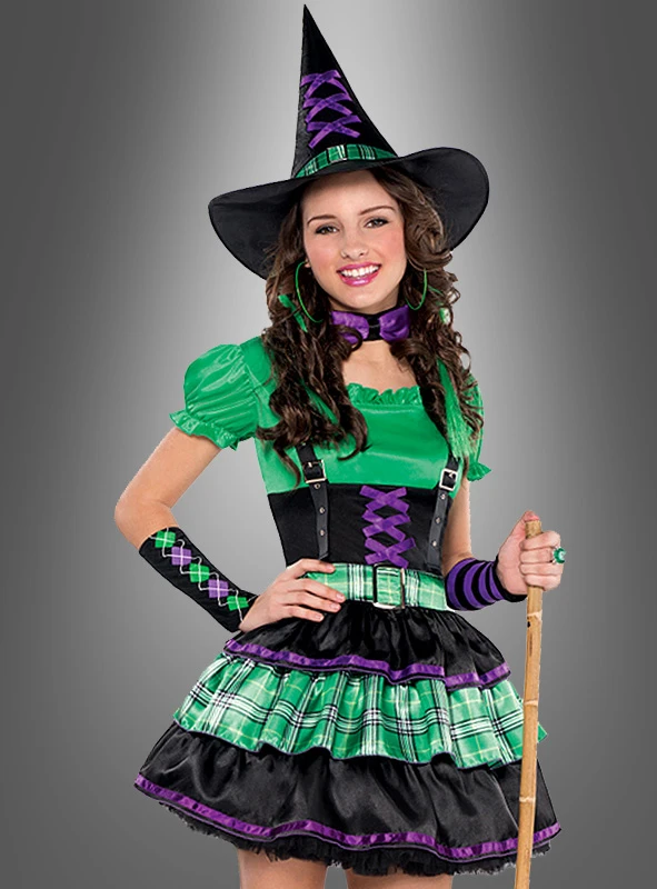 Das perfekte Hexenkostüm für Teenager benötigt noch einen passenden Spitzhut, der im Lieferumfang enthalten ist. Zusätzlich erhalten Sie ein schwarzes Halsband, welches mit einer violetten Schleife geschmückt ist. Zwei schwarze Armstulpen mit unterschiedlichen Mustern, sowie zwei verschieden gestaltete Kniestrümpfe runden das coole Hexenkostüm für Jugendliche ab und sind ebenfalls in der Lieferung enthalten.