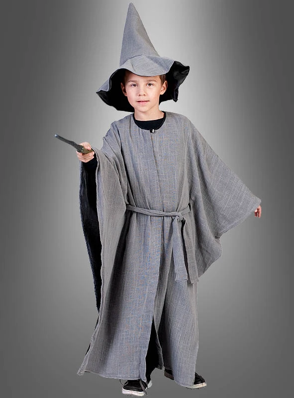 Das Zauberergewand besteht innen aus schwarzem Satinstoff und außen aus löchrig zerfetztem grauen Mullstoff. Der Hut ist aus dem gleichen Material. Selbstverständlich darf auch das Gürtelband nicht fehlen, um das Outfit zu komplettieren. Ein Zauberstab kann separat bestellt werden. Das Kostüm eignet sich ideal für Jungs als auch für Mädchen, denn es kann genauso gut eine Hexe darstellen.