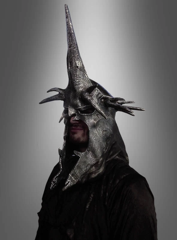 Zum Original Filmkostüm gehört der enorme Helm, die Maske aus Latex, die den Ringgeist erst zum wirklichen Hexenkönig macht. Wie auf dem zweiten Bild zu sehen ist, ist die Maske vorne offen und hier mit einem durchsichtigen Netzstoff versehen. Ein klarer Vorteil. So ist die Luftzufuhr gewährleistet und einem Getränk zwischendurch steht nichts im Wege. Der Helm mit den beeindruckenden Dornen ist im Antiklook silbrig-grau bemalt und sieht täuschend echt wie ein Eisenhelm aus.