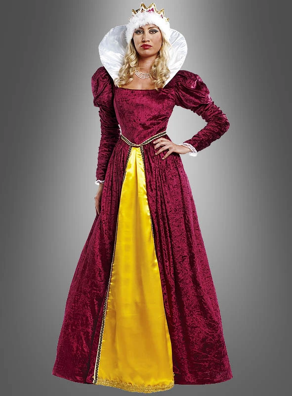 Typisch für ein königliches Gewand dieser Zeit sind die Puffärmel. Im unteren Bereich sind die Ärmel gerafft. Das Königin Kostüm hat einen üppigen Rockteil. Er ist bodenlang und weit geschnitten. Vorne hat er einen Einsatz aus glänzendem Satin in Gelbgold und ist mit einer schicken Borte verziert. Zusätzlich ist ein extra Unterrock aus festem Material in das Kleid eingearbeitet. Er hat mehreren Lagen Rüschen am Saum. Dadurch entsteht noch mehr Volumen – unverzichtbar für einen königlichen Auftritt. Wer verbeugt sich da nicht ehrfürchtig, wenn Ihre Majestät den Saal betritt!