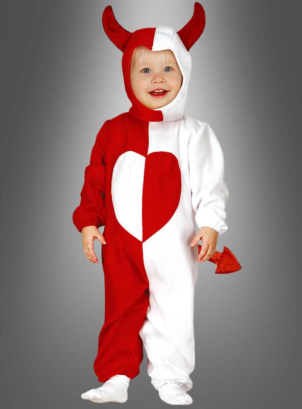 Mit einem Engelsgesicht lächelt das Baby Sie an. Dabei hat das Kind es faustdick hinter den Ohren und ist genauso, wie alle Kinder sein sollten. Neugierig, verspielt und wild. Ein echtes Bengelchen eben. Im flauschig weichen Overall aus kuscheligem Vlies fühlt sich das Kind wohl. Die eine Seite ist teuflisch rot und die andere himmlisch weiß gestaltet. Auf dem Bauch kann man ein farblich seitenverkehrtes Herz sehen. Die Saumabschlüsse von Ärmeln und Hosenbeinen sind mit leichtem Gummizug versehen. Am oberen Rücken ist ein kleiner Klettverschluss angebracht. Der lustige Teufelsschwanz aus leicht schimmerndem rotem Taft ist angenäht und kann so nicht verloren gehen.