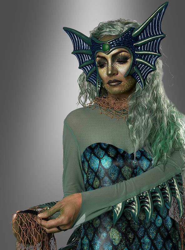 Das wunderschöne Meerjungfrau Seehexe Kostüm besticht durch seine ausgefallenen Flossen, die seitlich am Körper und an den Ärmeln der Unterarme angebracht sind. Die Flossen schillern grünlich-golden und sind aus leichtem, weichem Latex in 3D ausgeformt. Auch die Krone dieser Meeresgöttin ist mit seitlichen Flossen gearbeitet. Der grüne Schmuckstein ist aufgemalt. Die Krone wird mit zwei dünnen Hutgummi am Kopf gehalten, drückt oder stört überhaupt nicht. Ein tolles Accessoire, das nicht jeder hat.