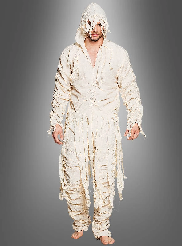 Die passende Hose hat im Bund ein Gummiband. Die überlangen Hosenbeine werden ebenfalls durch Gummibänder in Längsrichtung gebauscht, sodass die typische Bandagen-Optik entsteht. In dieser erstklassigen Verkleidung sehen Sie im Nu aus, als wären Sie über und über in Mullbinden gewickelt. Dieser Effekt wird durch die etwa 3 Zentimeter breiten, langen Stoffstreifen am Saum des Oberteils verstärkt. An der Kapuze und im Nacken wird dieses Detail aufgegriffen und weitergespielt. So sorgen Material und Optik beim Mumie Kostüm für das realistische Mumien-Aussehen, mit dem Sie auf jeder Mottoparty eine hervorragende Figur machen – ganz ohne sich zu verheddern.
