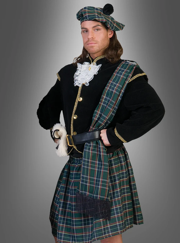 Tolles Schottenkostüm mit typischem Karomuster. Die Jacke ist mit goldener Borte und Knöpfen verziert. Ebenfalls im Lieferumfang enthalten sind ein Schottenrock, eine Mütze, ein Jabot und ein Gürtel mit einer kleinen Tasche aus Kunstfell.