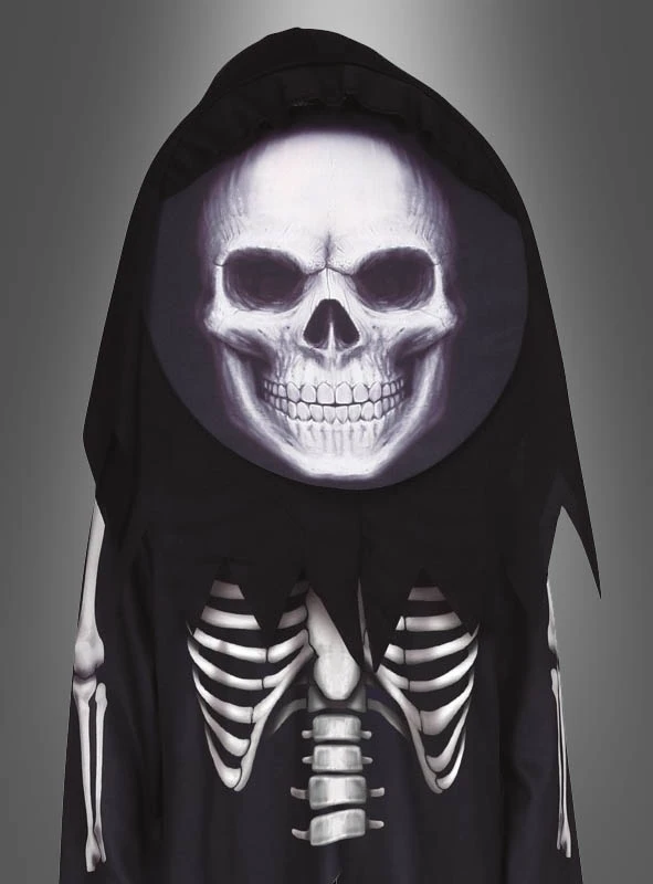 Als Knochenmann oder in einer Reaper Robe verkleiden sich viele Kinder an Halloween. Aber in diesem Skelett Kostüm mit großer Totenkopf Maske wird man auffallen. Das Kinderkostüm besteht aus einem schwarzen Oberteil und Hose, die mit weißen Knochen und Gerippe bedruckt sind. Die Hose ist mit einem bequemen Gummizug im Bund ausgestattet. Das Oberteil mit dem fetzig in Zacken geschnittenen Saum ist leicht dehnbar und angenehm zu tragen.