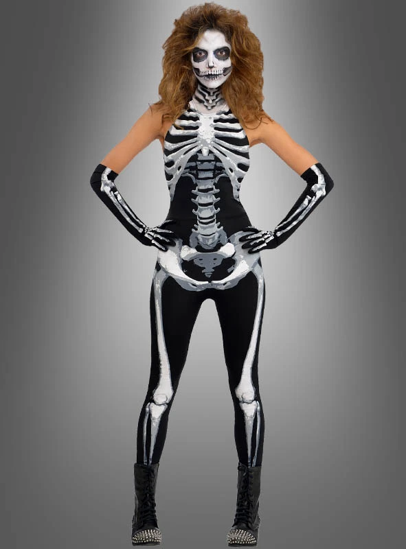 Hautenger Catsuit Overall, der sehr figurbetont getragen wird. Schulterfreier Neckholder Anzug mit tollem Knochenprint im vorderen Bereich. Die Knochen sind nicht einfach in Weiß aufgedruckt sondern zeigen Schattierungen in Grautönen. Das gibt der Skelettdame ein tolles dreidimensionales Aussehen. Ein Röntgengerät könne es nicht besser einfangen. Das Skelett Kostüm für Damen ist bequem und bietet viel Bewegungsfreiheit. Der Overall ist rückenfrei und wird im Nacken mit Bändern gebunden. Auf der Rückseite ist der Overall komplett schwarz. Die tollen langen Handschuhe mit dem Knochendruck sind ebenfalls mit dabei.